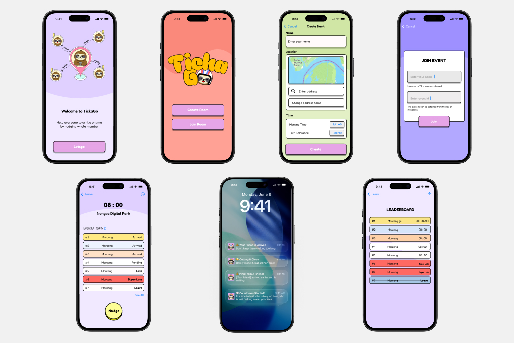 TickaGo is a social utility app that helps groups stay punctual by tracking attendance at shared events. Users can create or join rooms, set meeting details, and monitor arrivals in real time. With features such as nudging late members with push notifications and a leaderboard system, TickaGo encourages punctuality while keeping the experience fun and engaging.